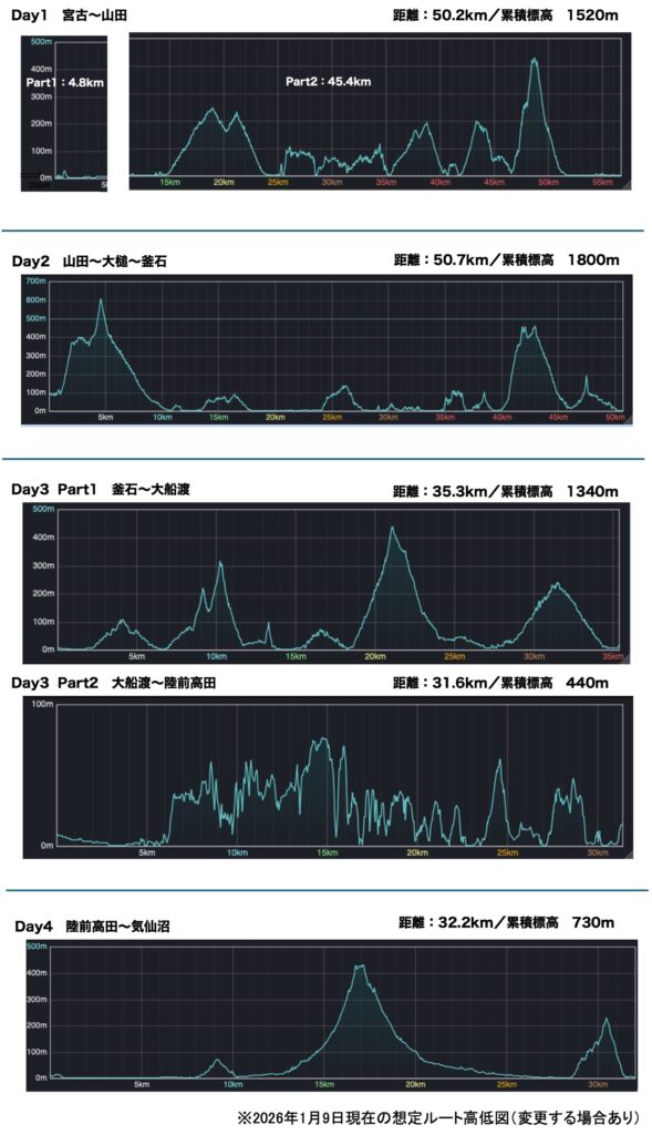 三陸のロード+トレイル+オリエンテーリング=SRS 東日本大震災から15年。復興している三陸リアス海岸を泊まりながら走る「ステージレース三陸(SRS)」。ロードレースとトレイルランニング、そしてオリエンテーリングが融合した新しい形のランニングイベントです。SRS200は、岩手・宮城両県を走破する「ステージレース三陸311」につながる第3回大会として、3泊4日で全長200kmを走破します。今回は1泊2日100kmの「ハーフ」も開催します。皆さんも是非一緒に三陸の”走る旅”を楽しみましょう! 第3回ステージレース三陸 SRS200/100 【大会主旨】 この大会は「東日本大震災から復興している三陸地方の新しい魅力を発見し、それを広く伝えていく。」「タイムや順位を競うだけでなく、“走る旅”という新たなスポーツを広める。」ことを主旨とし、岩手・宮城両県をつなぐ「ステージレース三陸311」につなぐ第3回イベントとして開催します。 定員に達したため、出場者募集は1月12日で終了しました。 たくさんのお申込み、ありがとうございました。 エントリー(モシコム) スポーツエントリー 大会規約 大会をサポートいただくボランティアは継続して募集中です。(活動期間:2026年5月2日〜5日) ボランティアとしてエントリー 【大会概要】 ⚫︎大会名:第3回ステージレース三陸 SRS200/100⚫︎開催日:フル(4日間):2026年5月2日(土) 〜5日(火・祝)ハーフ(2日間):2026年5月2日(土) 〜3日(日)⚫︎走行距離:フル200km/ハーフ100km⚫︎スタート:宮古市・浄土ヶ浜⚫︎フィニッシュ:(フル)気仙沼市・内湾地区/(ハーフ)釜石市・釜石市民会館TETTO⚫︎主催:特定非営利活動法人ディスカバー・リアス⚫︎後援(予定):岩手県、宮古市、山田町、大槌町、釜石市、大船渡市、陸前高田市、宮城県、気仙沼市、および各地域の商工会議所・観光協会⚫︎特別協力: 三陸鉄道株式会社★サントリー東北サンさんプロジェクト・シンみらいチャレンジプログラム支援事業【募集期間・参加料】募集期間を2期に分け、早期に申し込まれる方の参加料を割引します。第1期:2025年11月21日(金)〜2026年1月12日(月/祝)※終了しましたフル(4日間) ソロ:¥50,000/人 ペア:¥90,000/組ハーフ(2日間) ソロ:¥35,000/人 ペア:¥64,000/組第2期:2026年1月13日(火)〜3月11日(水) ※定員に達したため募集しませんフル(4日間)ソロ:¥55,000/人 ペア:¥100,000/組ハーフ(2日間)ソロ:¥38,000/人 ペア:¥70,000/組※先着順で定員に達し次第応募を締め切ります。※キャンセル者等が出た場合は、追加募集を行うこともあります。※参加料に宿泊費は含まみません。競技中の交通費は含みます。※詳細なルールやスケジュールなどは、大会規約をご覧ください。 【競技概要】 <競技全体について>●3泊4日または1泊2日の旅の中に3種類の競技「ロードレース」「トレイルレース」「オリエンテーリング」を融合させた新しい形式のレースです。●カテゴリーはペア(混合・女子・男子)、ソロ(女子・男子)の5種類です。●主催者が事前に公表する地図およびGPS情報を参照し、指定されたチェックポイント(CP)を順番に通過するのが基本的なルールです。チェックポイントをつなぐルートは指定しませんが、一部の区間には主催者による誘導の指示があります。 <走行エリアおよび想定ルートについて>●走行するエリアの地図やCPの名前や位置情報などは大会の約1週間前にお知らせします。この図は現在予定しているCPを最短距離でつないだ想定ルートの高低図ですので、難易度の参考にしてください。※大船渡市山林火災の復旧状況などの影響で未確定部分もあるので、CPやルートを変更する可能性があります。●以下、各日の想定ルートの距離/累積標高/トレイル率です。・Day-1(5/2)宮古市〜山田町:50km/1520m/50%・Day-2(5/3)山田町〜大槌町〜釜石市:51km/1800m/32%・Day-3(5/4)釜石市〜大船渡市〜陸前高田市:67km/1780m/26%・Day-4(5/5)陸前高田市〜気仙沼市:32km/730m/32%※距離・累積標高は全て概算です。※ハーフはDay1&2(宮古市〜釜石市)のみの約100kmです。他の2日間のハーフ設定はありません。 ●Day1とDay3はPart1、Part2に分かれています。2つのパートの間は三陸鉄道で移動する予定です。その移動区間は走行距離に含みません。(乗降する駅もCPとなるため、CP発表時までお伝えできません)●関門時刻が設定されたCPまたはゴールで制限時刻をオーバーした場合、その日の完走は認められませんが、翌日以降の競技には参加できます。●大会のスケジュール(スタート時間、終了時間)については、下記にある「宿泊・食事・アクセス情報」ページに記しています。 <宿泊・食事・移動について>●泊まりながら毎日走るのがステージレース最大の魅力です。宿泊先は地元の旅行会社と提携し、主催者が推奨する宿泊施設をご案内しますが、それ以外の宿泊先をご自分で予約することもできます※参加料に宿泊費は含まれていません。※旅行会社の予約は1月中旬に開始します。●三陸ならではのグルメを食べながらレースを楽しみましょう。競技中のエイドステーションでも、三陸な